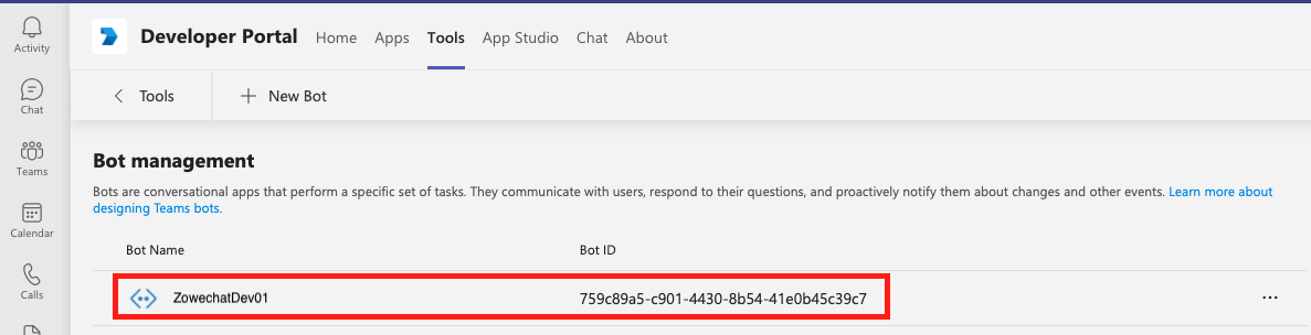3. Click the Bot management. Choose the bot that you created and start editing your bot app.